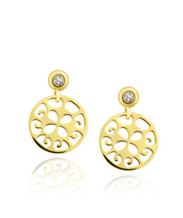 Golden earrings proposed in the form of a delicate openwork circle suspended on a stud adorned with a small stone. Extremely feminine jewelry referring to oriental climates. It is possible to complete with a bracelet for the hand or foot and with a pendant.