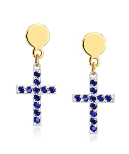 Jewelry designed in the form of delicate mini crosses set with blue stones. A product of symbolic sacred character. Stud earring with a butterfly clasp. Gold fineness 585.