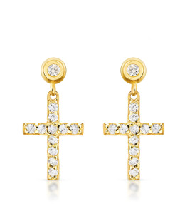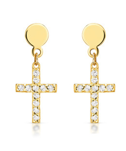 Gold stud earrings with an additional ornament in the form of a hanging, smooth cross.