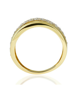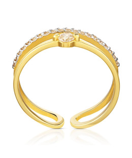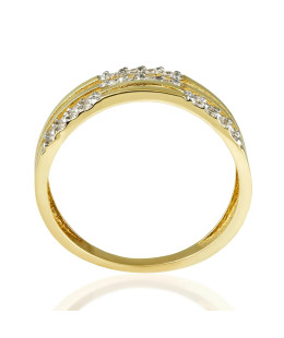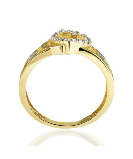 A modern, eye-catching design of a gold ring. Beautifully showcased central stone and asymmetrical decoration with small Cubic Zirconia. On a woman's hand, the ring looks very attractive and expressive. The ring combines timeless yellow gold with the extremely popular white shade, loved by ladies who prefer original jewelry in a modern edition. The presented model was created with women in mind who like to shine in company and attract attention. The interesting shape and large size of the ring make it impossible to pass by indifferently. The extraordinary form is perfectly highlighted by the sparkle of numerous zirconia on the sides. The jewelry will serve as an exceptional gift for a confident person who likes interesting and unconventional accessories that catch the eye.